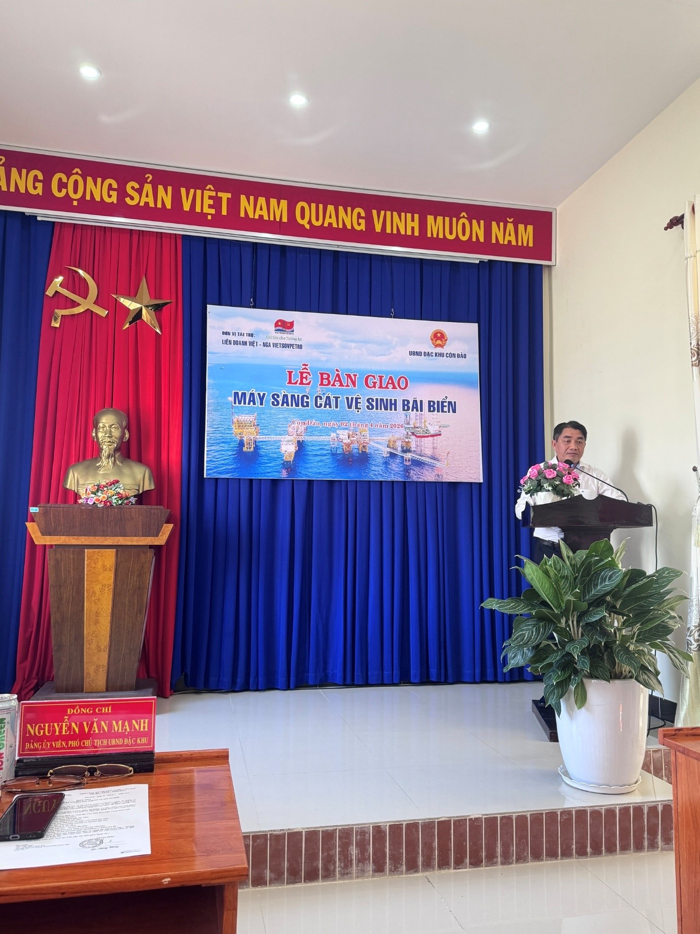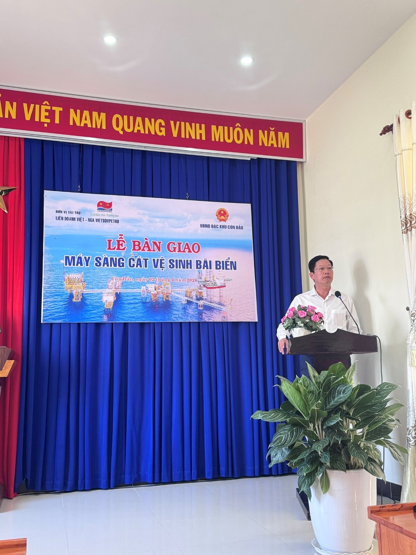 Thay mặt lãnh đạo Đặc khu Côn Đảo, ông Nguyễn Văn Mạnh – Đảng ủy viên, Phó Chủ tịch UBND Đặc khu đã phát biểu cảm ơn sự quan tâm, hỗ trợ thiết thực của Vietsovpetro đối với địa phương. Ông đánh giá cao những đóng góp của Vietsovpetro không chỉ trong lĩnh vực kinh tế mà còn trong công tác an sinh xã hội và bảo vệ môi trường, đồng thời bày tỏ tin tưởng thiết bị được trao tặng sẽ góp phần nâng cao hiệu quả công tác vệ sinh môi trường biển, giữ gìn cảnh quan xanh – sạch – đẹp cho Côn Đảo.