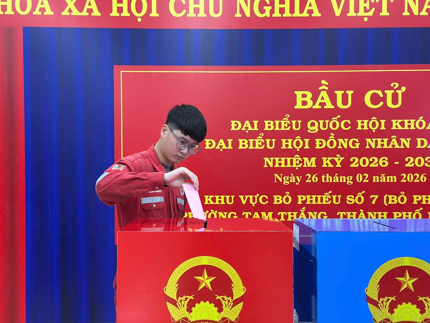 Sáng ngày 26/2/2026, tại khu vực bỏ phiếu số 7 (phường Tam Thắng, TPHCM), gần 200 cử tri là cán bộ, công nhân viên (CBCNV) đang công tác tại Liên doanh Việt – Nga Vietsovpetro và các nhà thầu đang thi công, làm việc trên các công trình biển, giàn khoan, tàu biển/phương tiện biển của Liên doanh đã tham gia bầu cử sớm đại biểu Quốc hội khóa XVI và đại biểu HĐND các cấp nhiệm kỳ 2026–203.